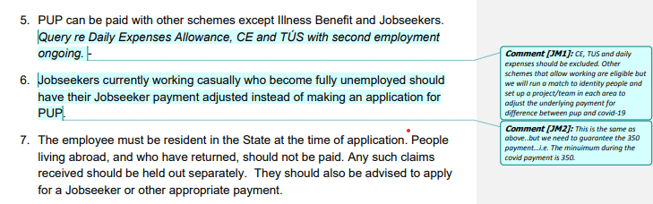 However, 23 March, is the first FOI record showing that the Secretary General of DEASP decided that asylum seekers who lost their jobs, where they reside in direct provision, would be excluded from PUP. The confirmation of this exclusion happened, not by legislation, but as a tracked Microsoft Word comment in a draft administrative circular. The Department of Justice were informed of DEASP’s approach to asylum seekers and PUP, with one Justice official noting the issue was ‘ambiguous’. In response, the a DEASP Assistant Secretary asked again for an explanation as to why asylum seekers were being excluded by DEASP policy. The response, from a DEASP Principle Officer, is worth providing in full,